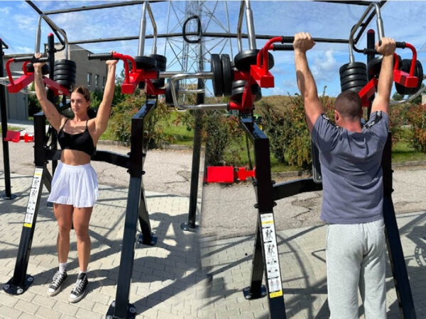 Oefening ter versterking van de schouderspieren. Vanuit staande houding de gewichten omhoog duwen tot de armen gestrekt zijn en langzaam weer laten zakken. Je kunt als uitgangspositie met je rug tegen de rugleuning gaan staan, of voor het toestel gaan staan met je neus richting het toestel.